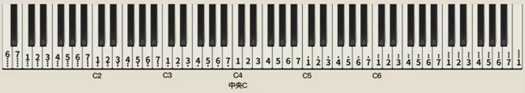 - 大七度(5 个全音 + 1 个半音):某个音的大七度 = 上方半音 + 八度,C → B