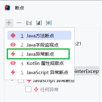 设置异常断点后,只要那一行代码会报这个异常,代码就会停在哪一行