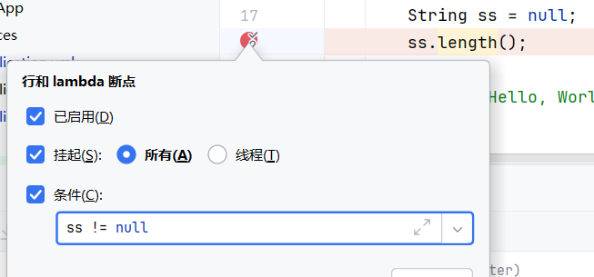 设置条件断点后,只有当条件符合,才会 debug 住,否则会继续往下执行