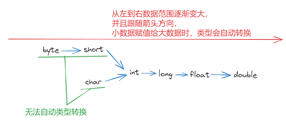 自动类型转换 :把数据范围小的数值或变量,赋值给另一个表示数据范围大的变量 :