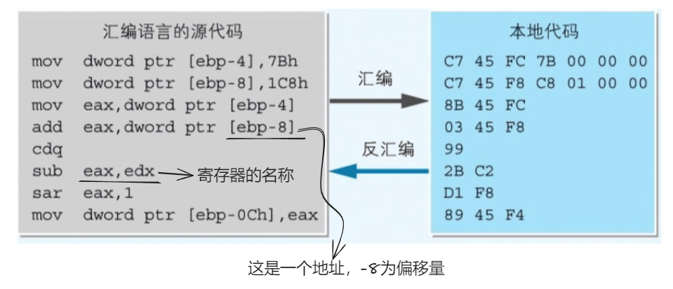 - 汇编语言与本地代码的关系 :用汇编语言编写的源代码中的每一条指令都对应着本地代码中的一条指令