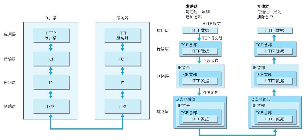- 接收端的服务器在链路层接收到数据,按序往上层发送,一直到应用层。