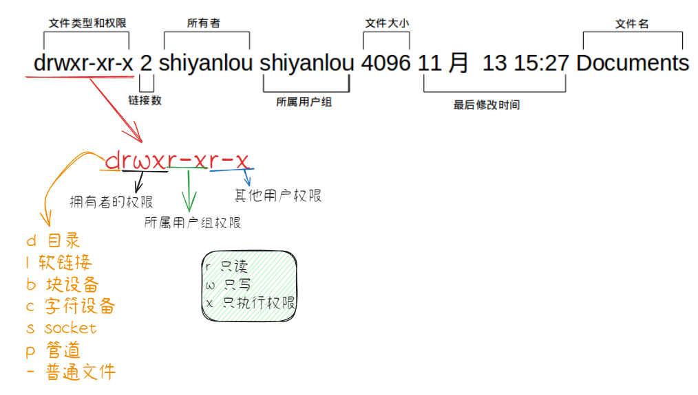 - 读权限:允许你读取目录的内容【查看目录中的文件列表和相关信息】